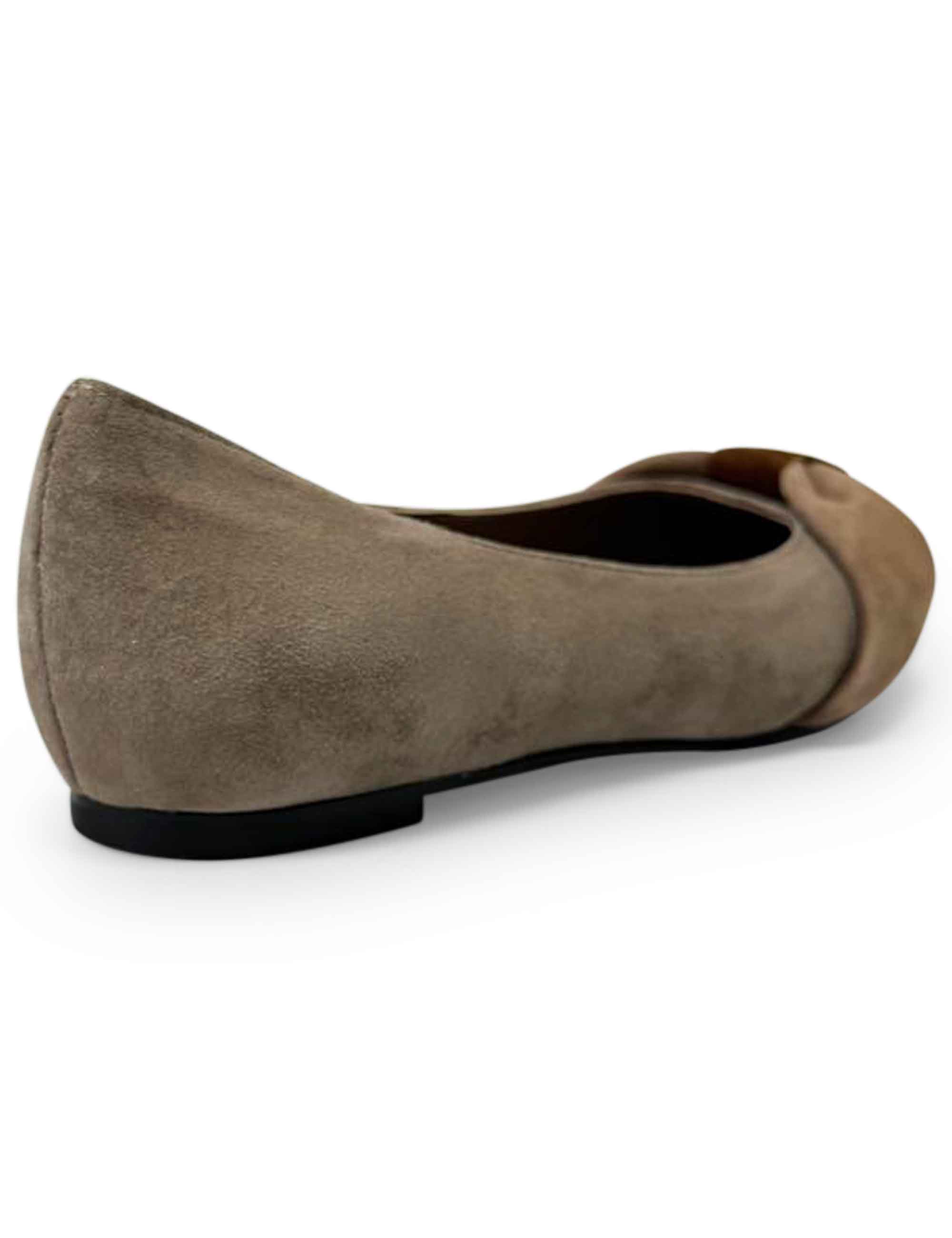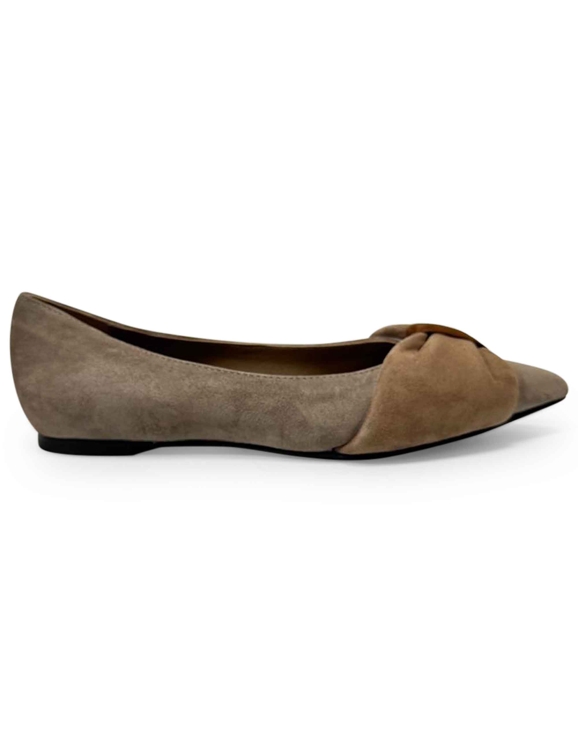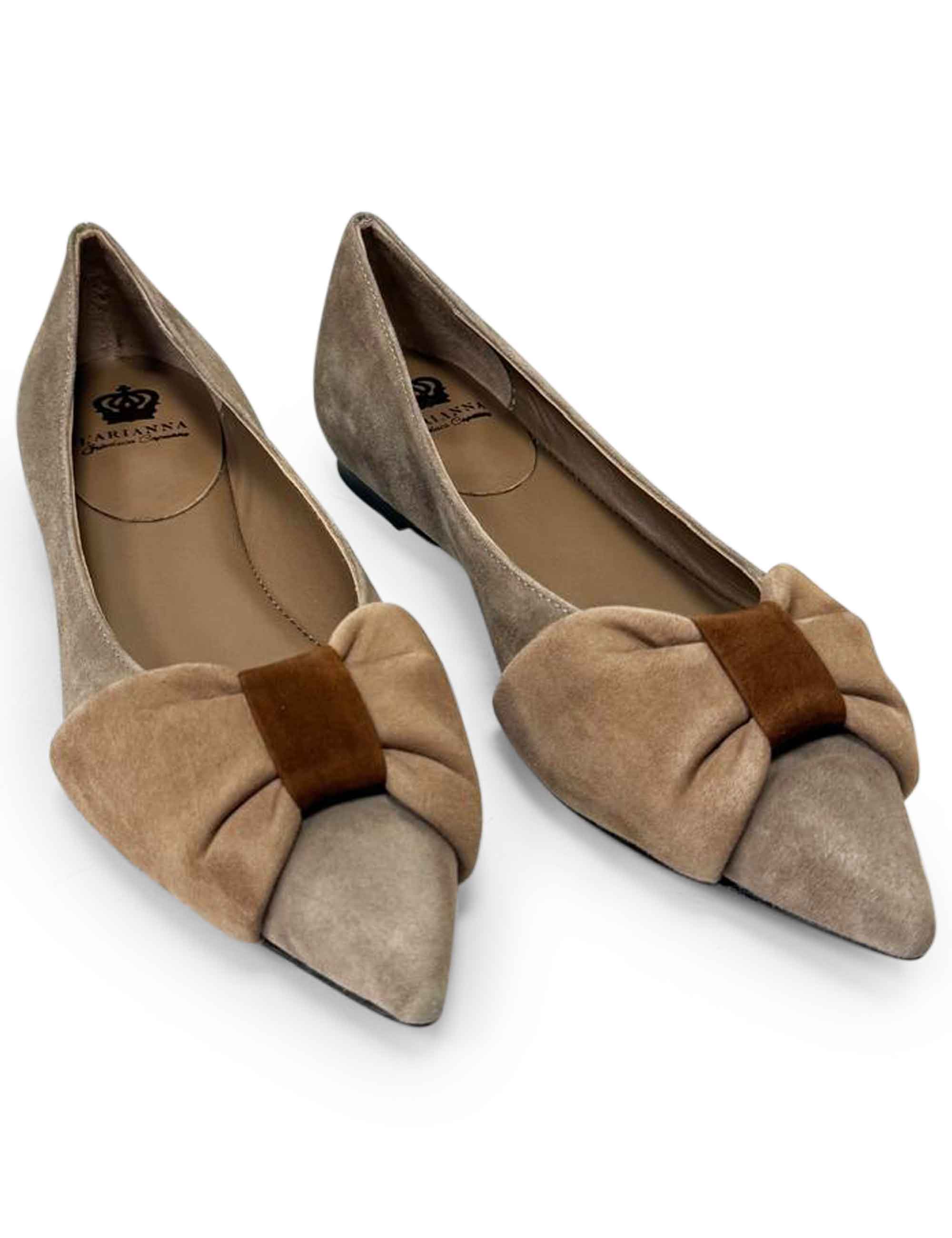 Ballerina in pelle grigia con fiocco, elegante e femminile. Realizzata artigianalmente in Italia con lavorazione a Sacchetto per garantire comfort e flessibilità.