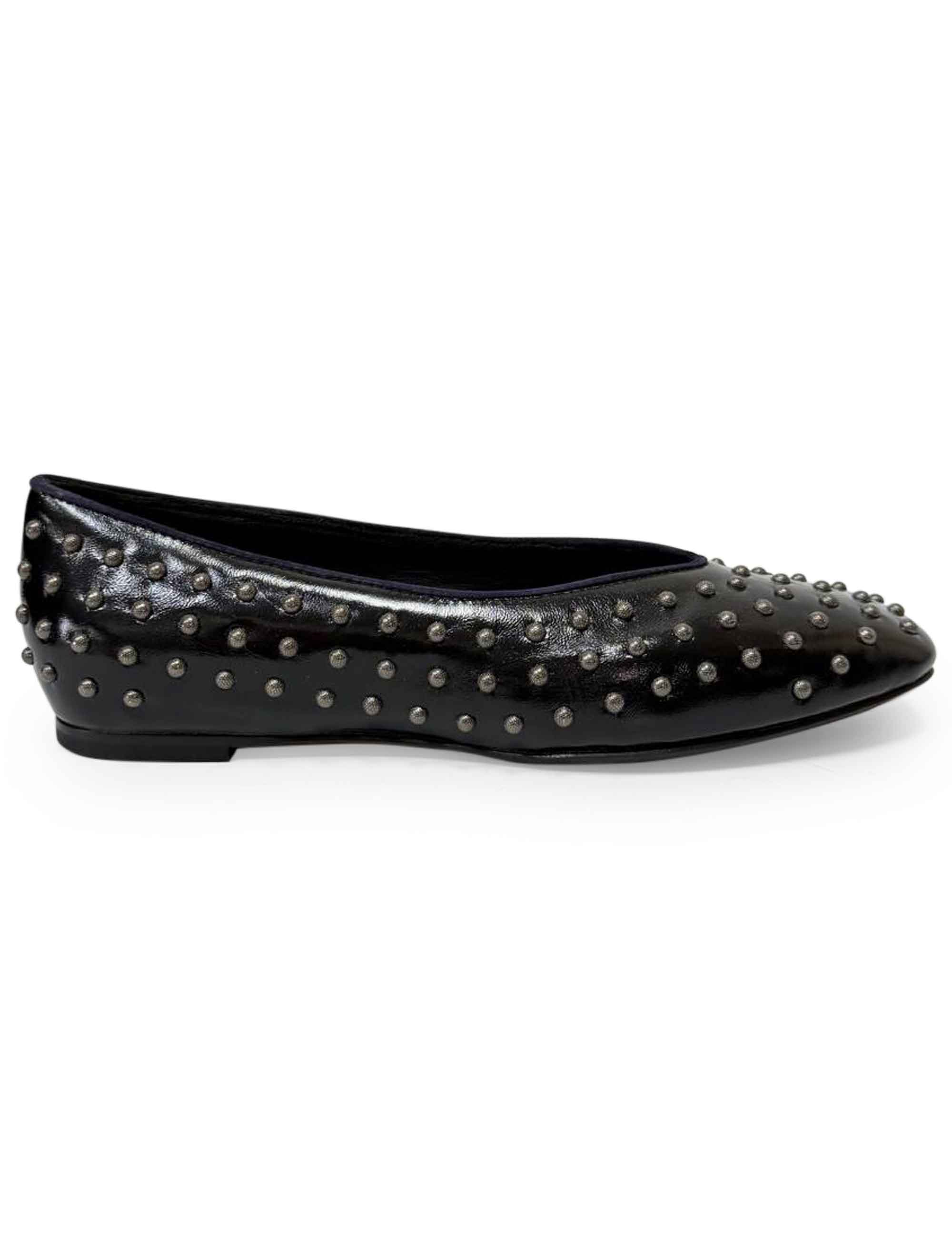 Ballerina in pelle nera con borchie, dallo stile elegante e grintoso. Realizzata artigianalmente in Italia con lavorazione a Sacchetto per garantire morbidezza e comfort.