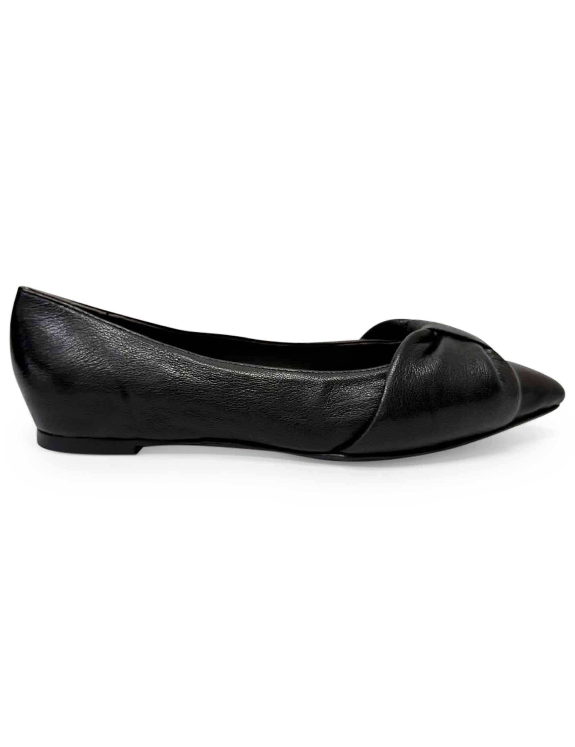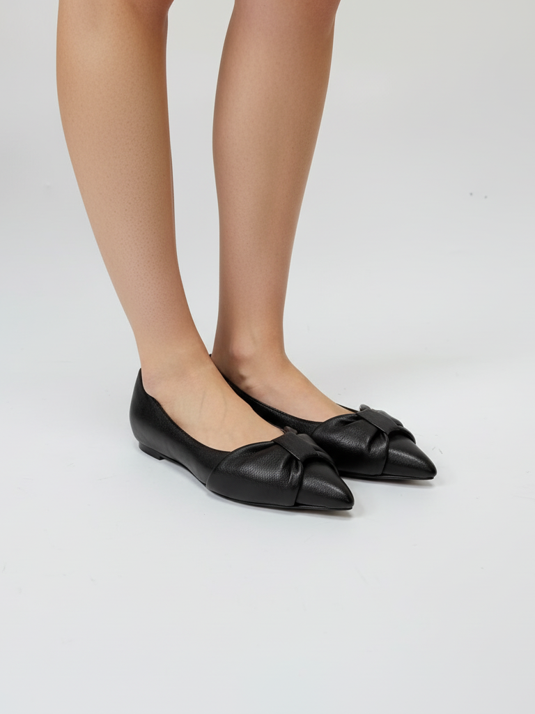 Ballerina in pelle nera con fiocco, elegante e femminile. Realizzata artigianalmente in Italia con lavorazione a Sacchetto per garantire comfort e flessibilità.