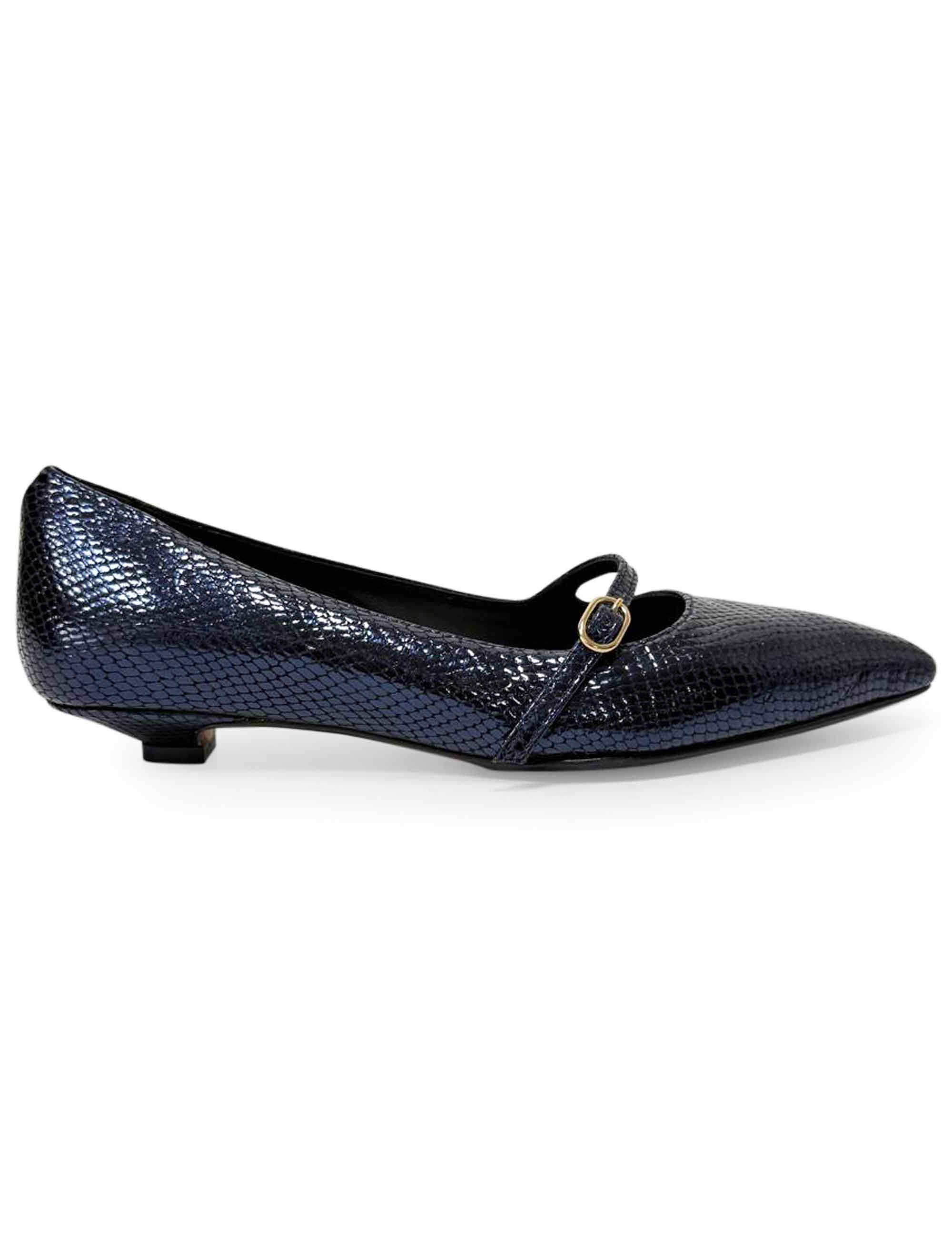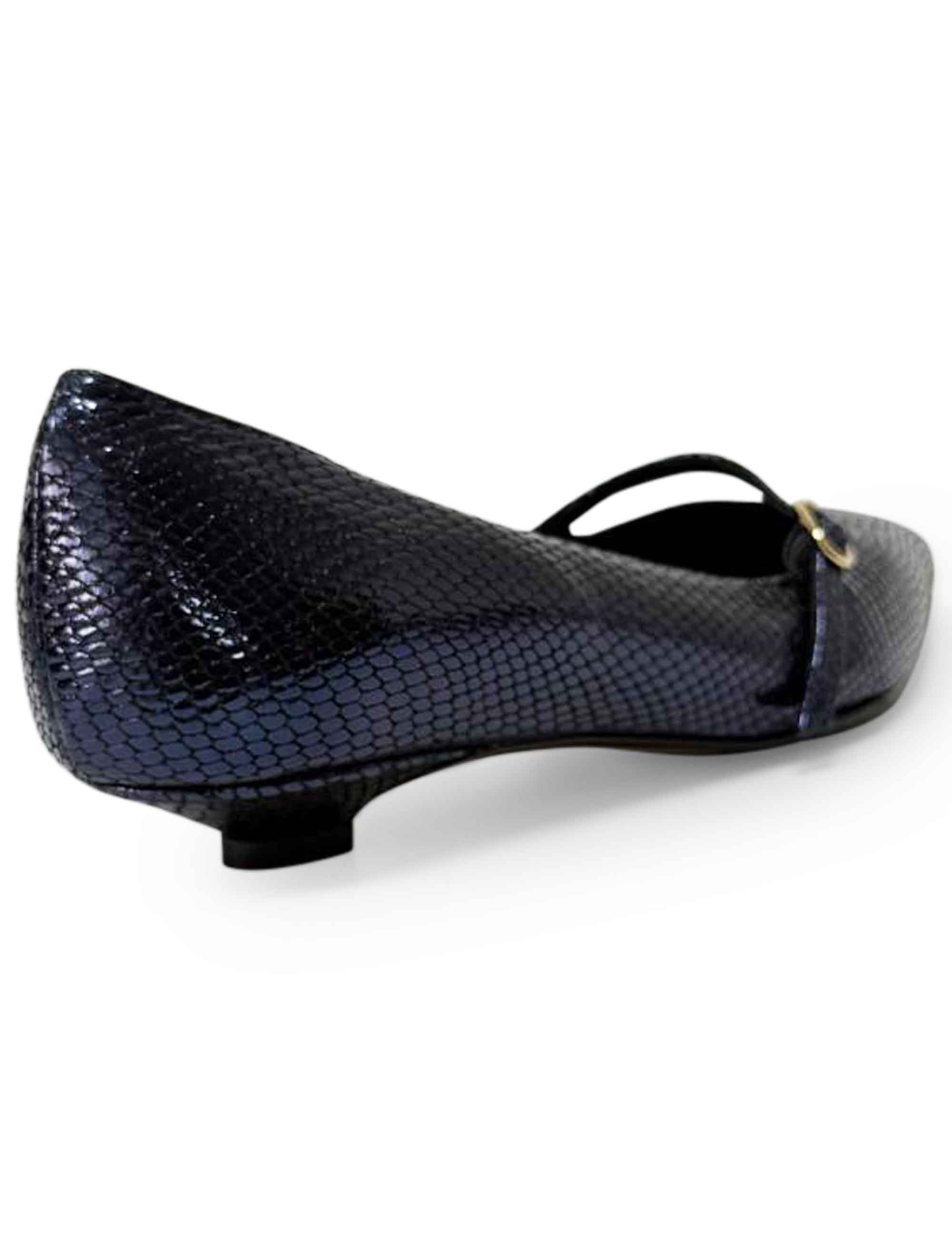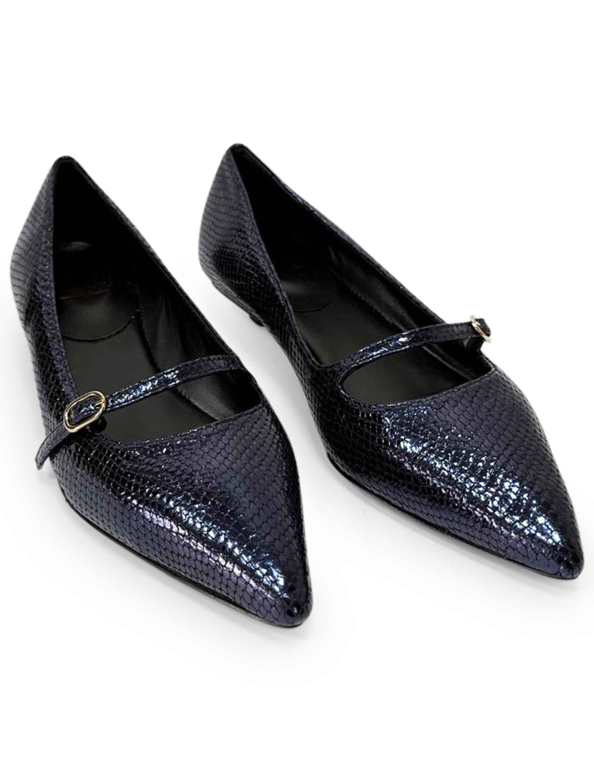 Ballerina in pelle stampa serpente blu, elegante e sofisticata. Realizzata artigianalmente in Italia con lavorazione a Sacchetto per offrire morbidezza e comfort.