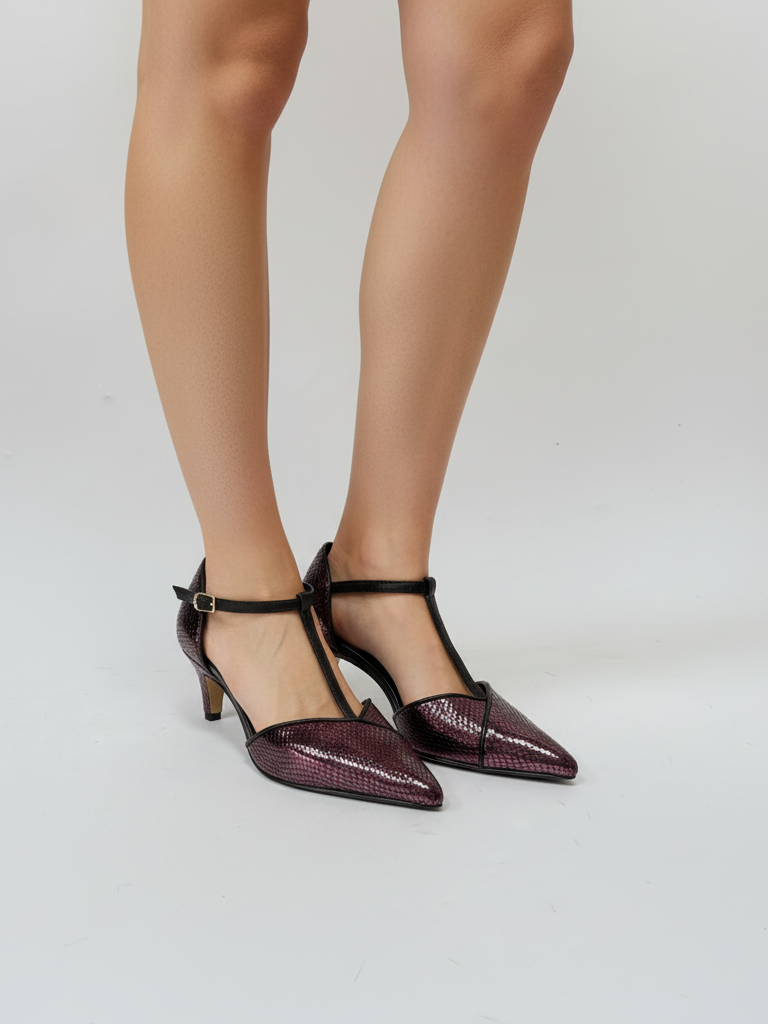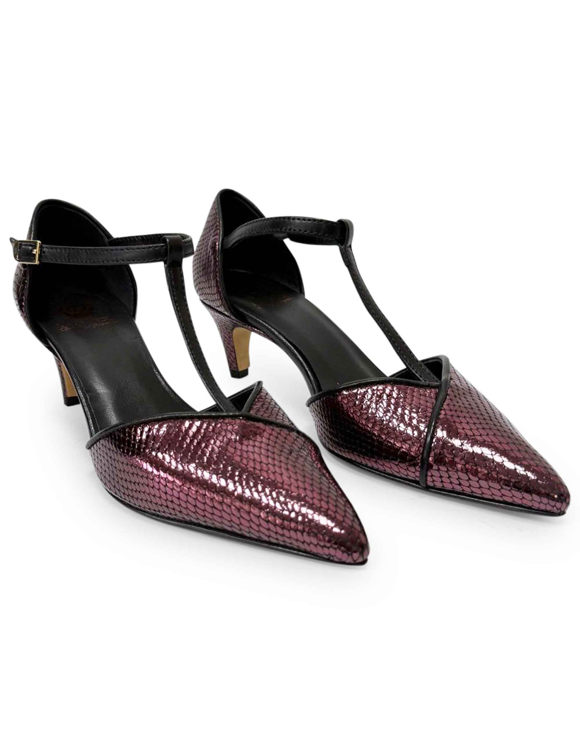 Décolleté in pelle effetto serpente laminato vino, elegante e femminile. Realizzata artigianalmente in Italia con lavorazione a Sacchetto per offrire comfort e flessibilità. Caratterizzata da chiusura a portafoglio e laccetto alla caviglia, per una calzata raffinata e stabile.