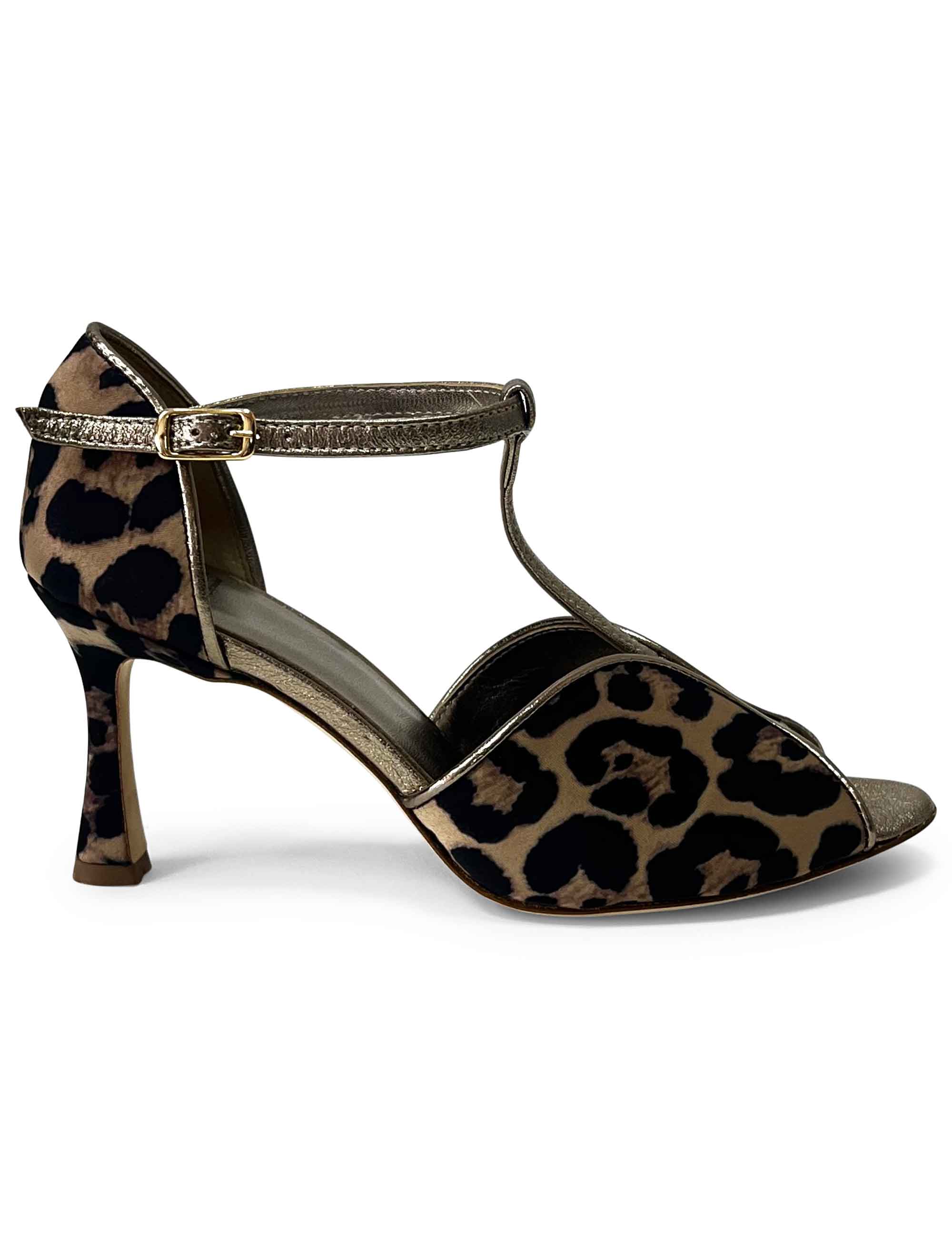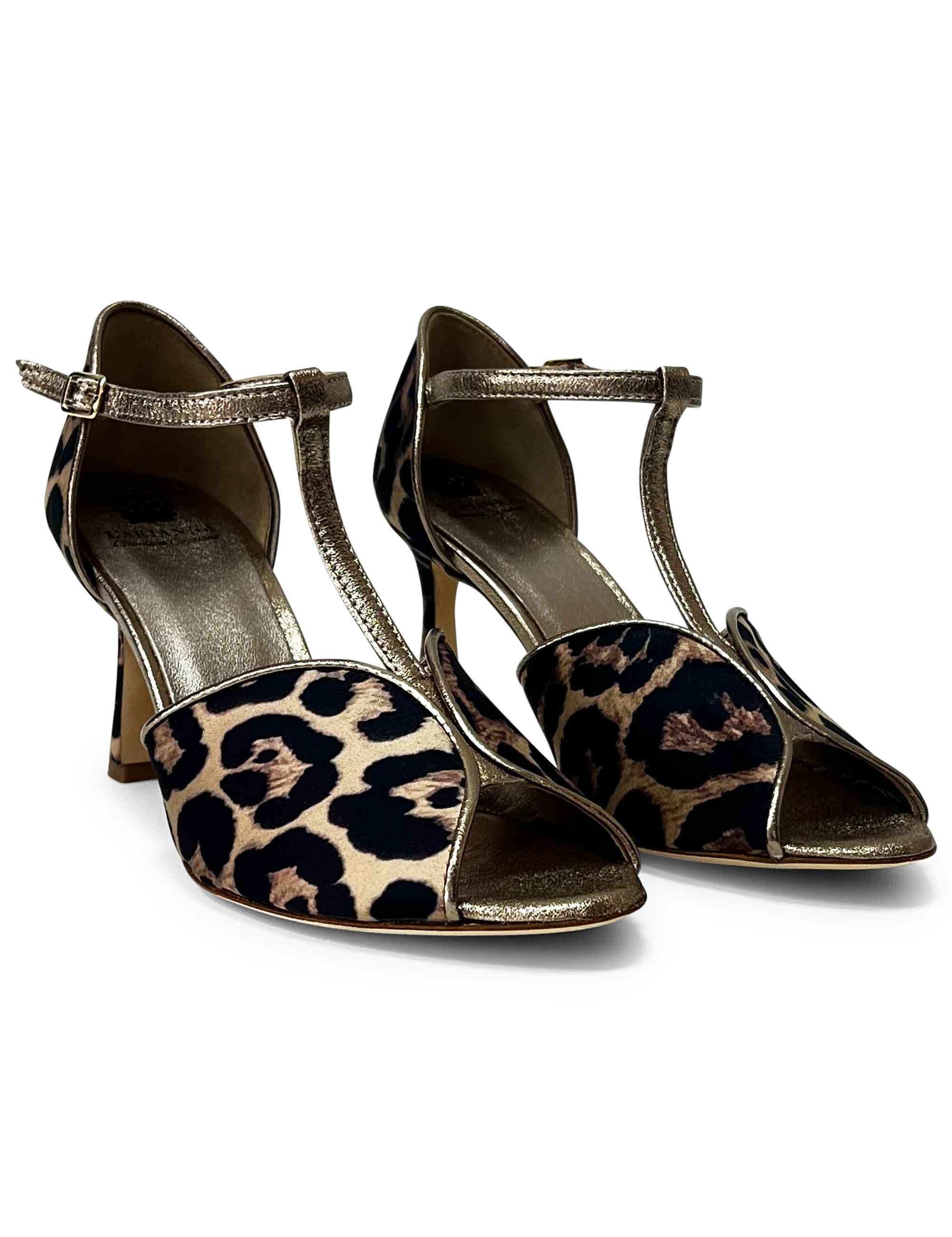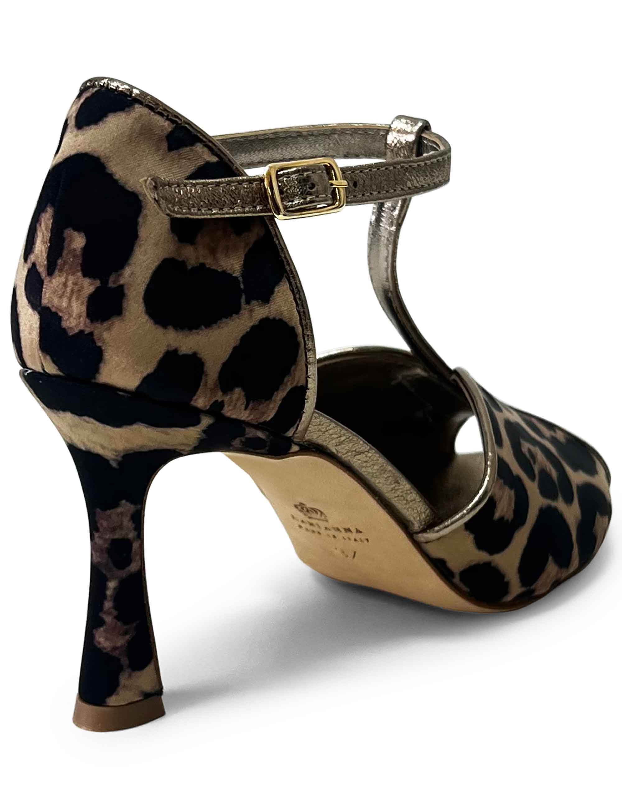 Décolleté spuntata da donna con cinturino alla caviglia in raso leopardato e inserti in pelle laminata color Alba, elegante e versatile. Un modello femminile e confortevole, ideale per completare look quotidiani o outfit più ricercati.