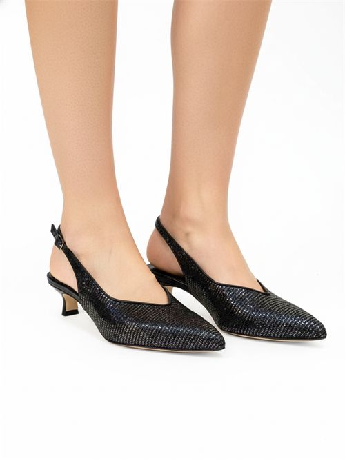 Décolleté slingback da donna realizzate in glitter moon color prugna, con punta affusolata e cinturino con fibbietta laterale. Un modello raffinato e femminile, completato da tacco in pelle tono su tono per un look elegante e versatile.