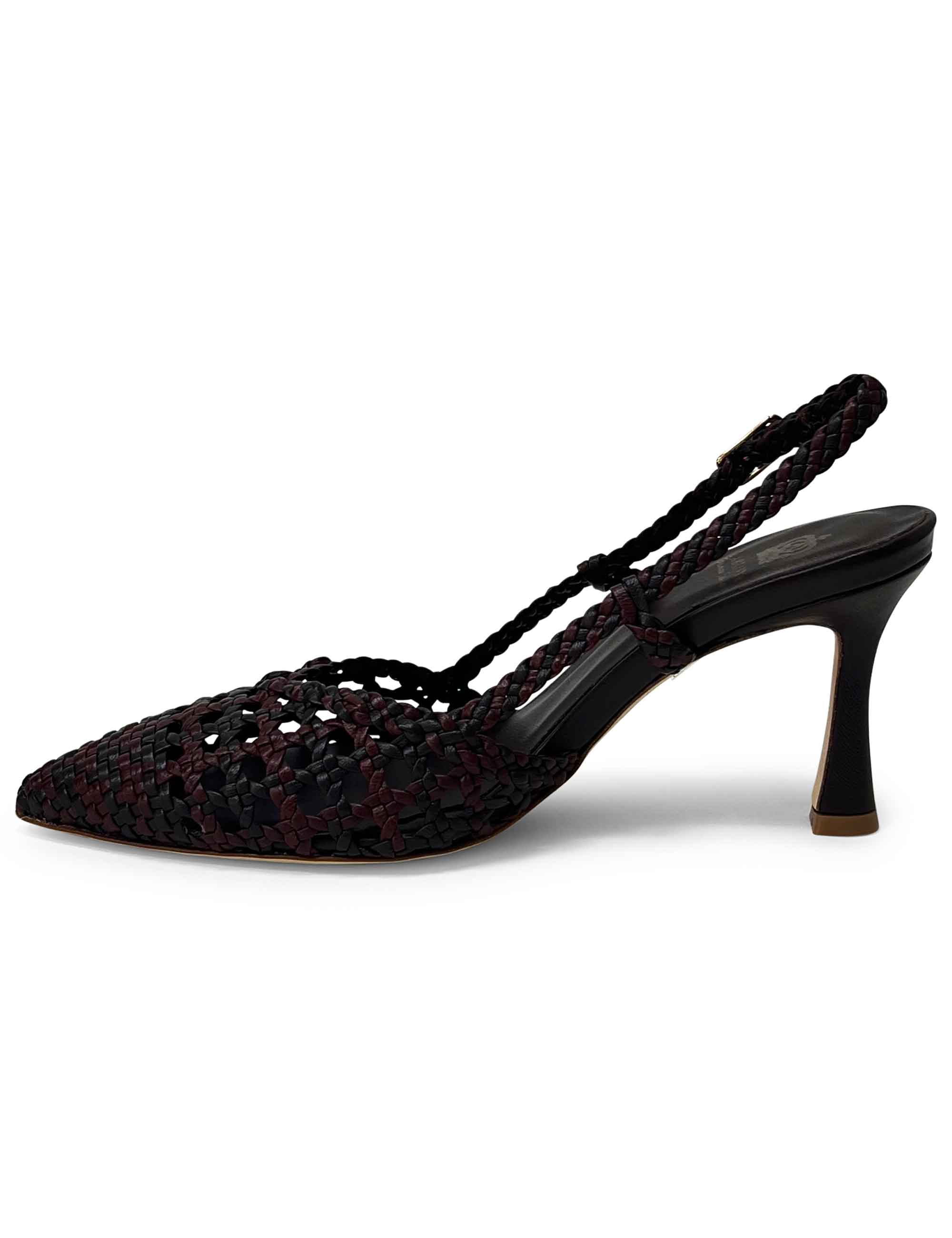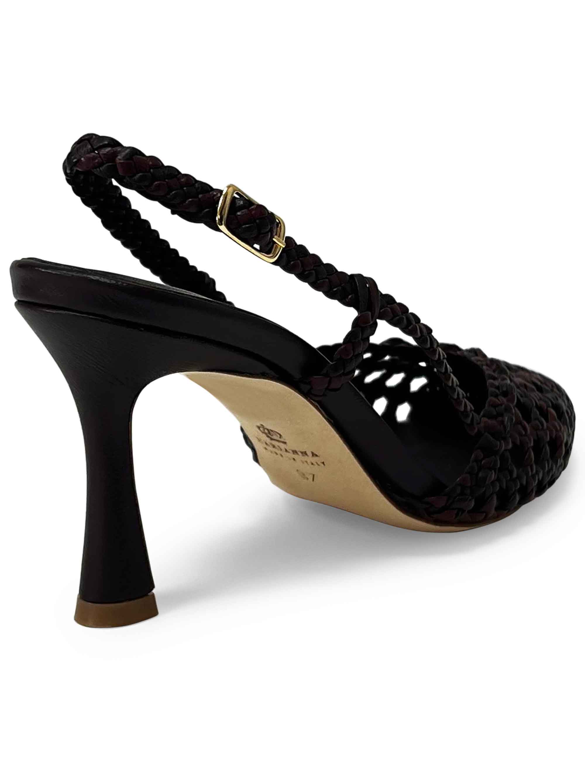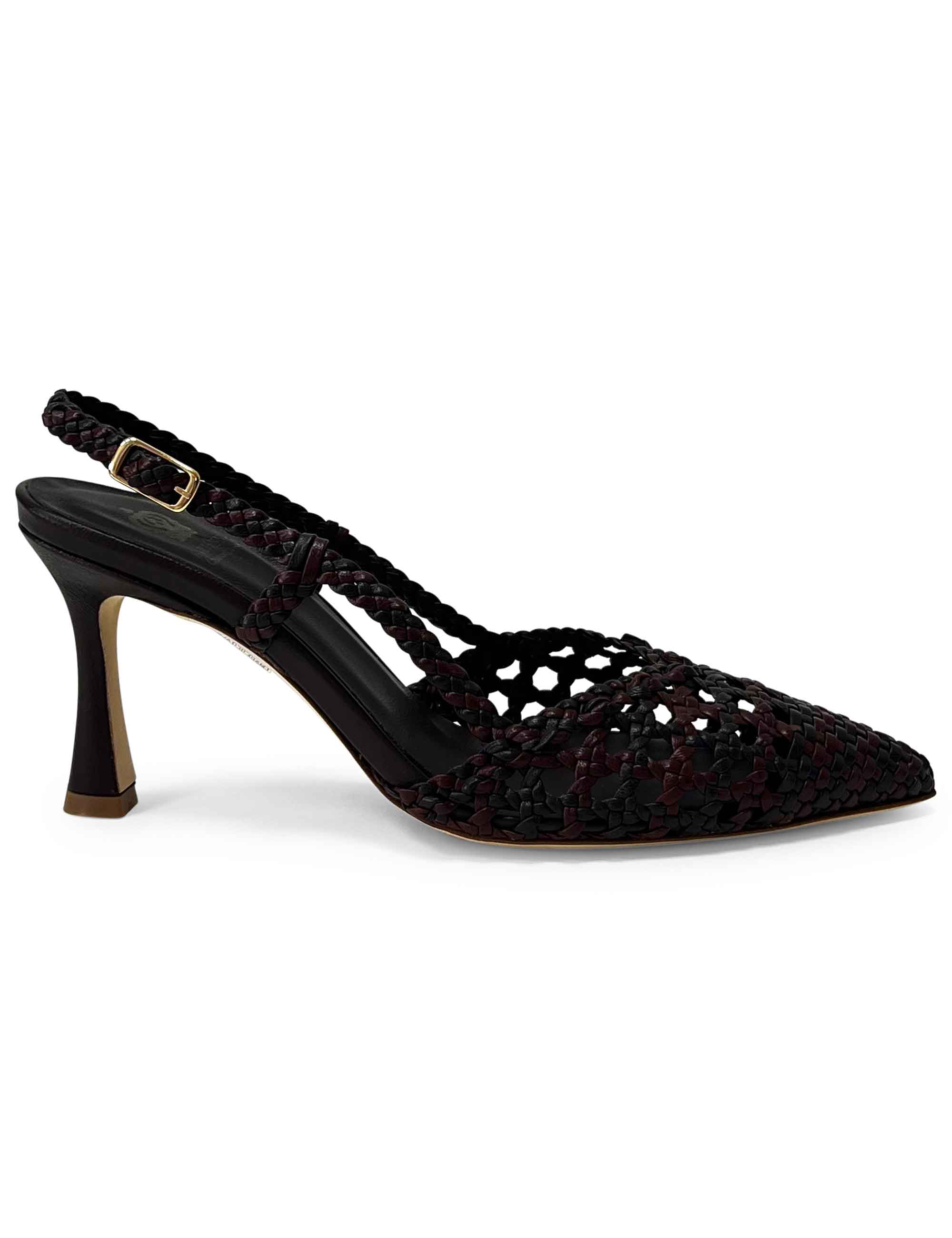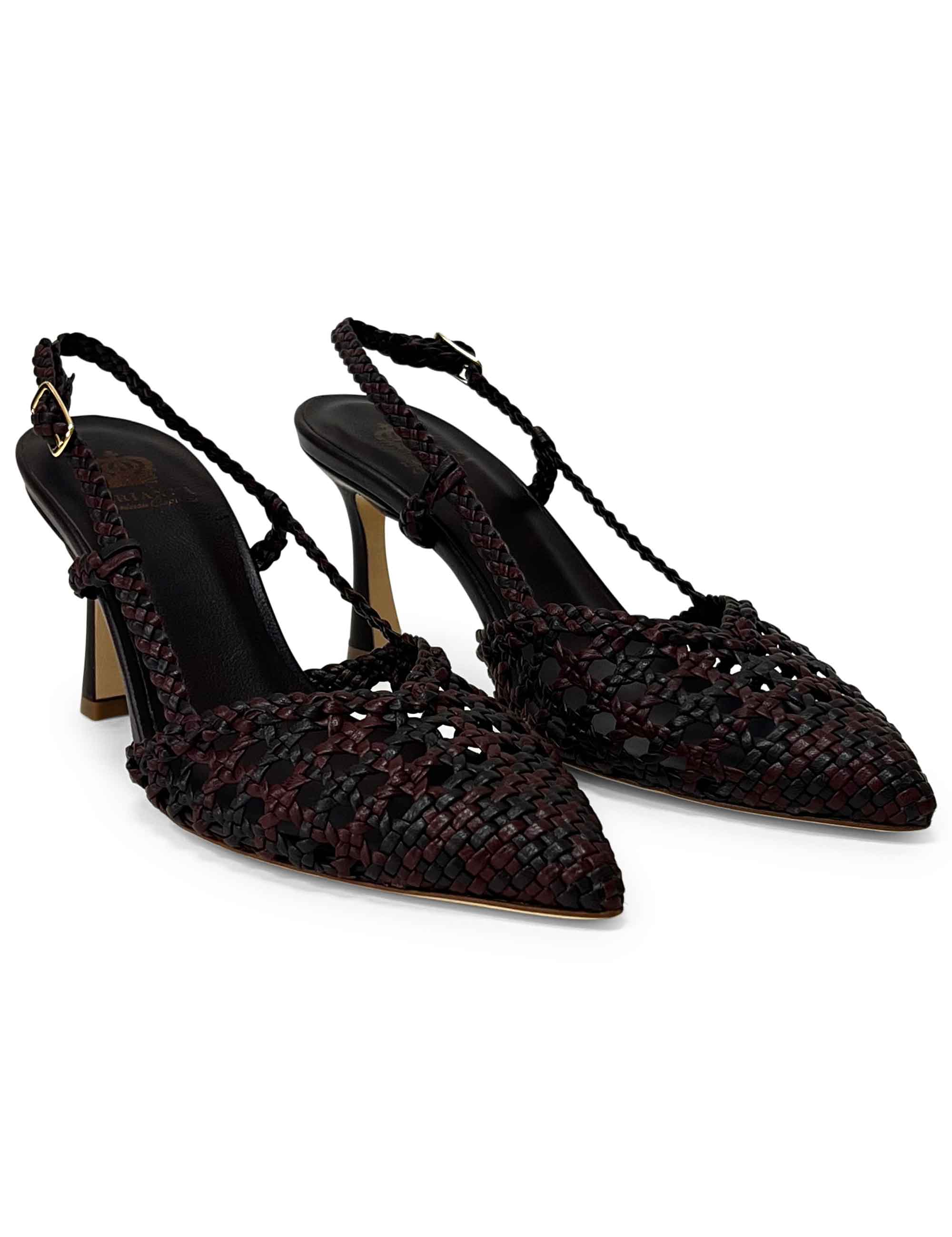 Décolleté slingback da donna in pregiato intreccio di pelle Caoba e Caffè, elegante e versatile. Un modello femminile e confortevole, ideale per completare look quotidiani o outfit più ricercati.