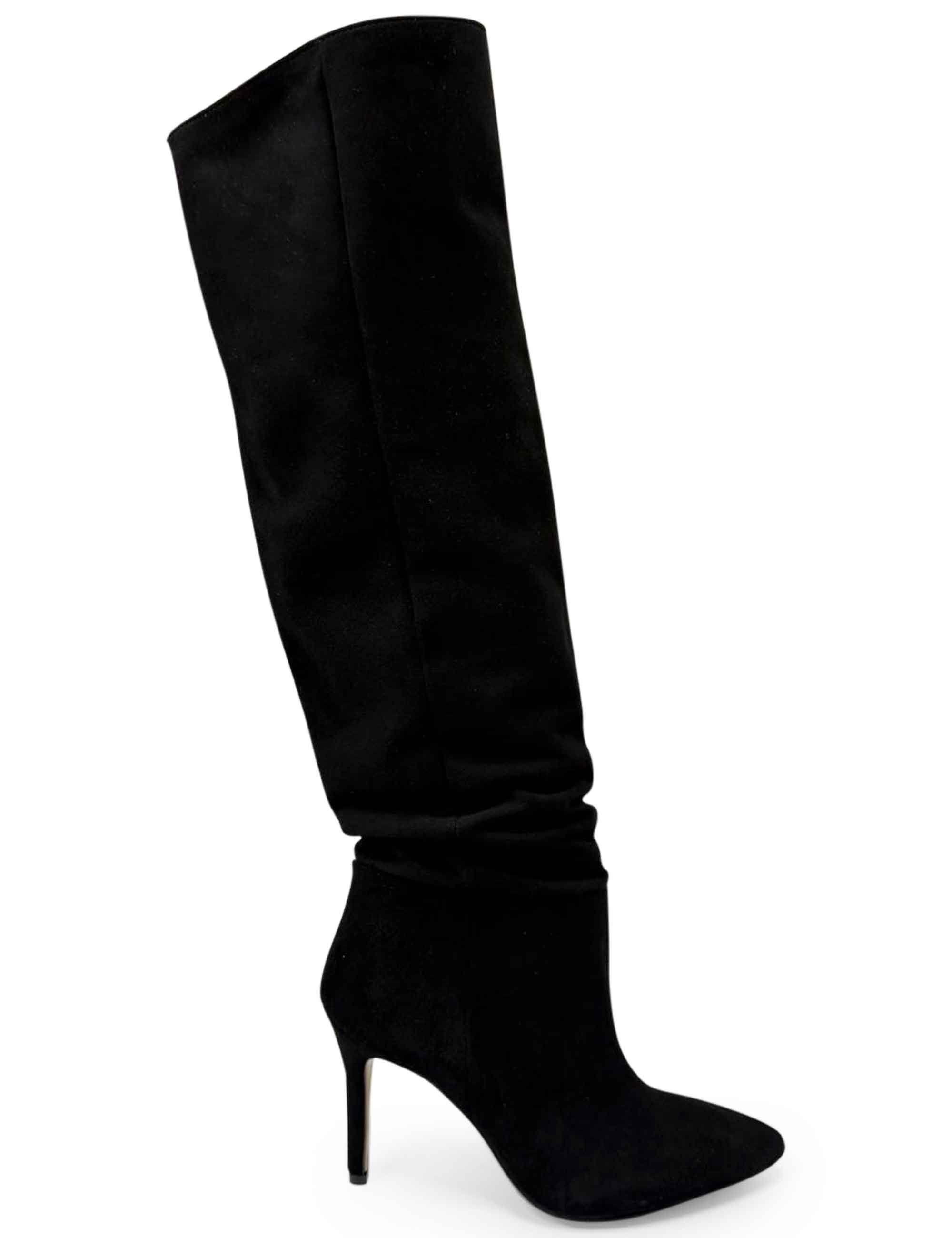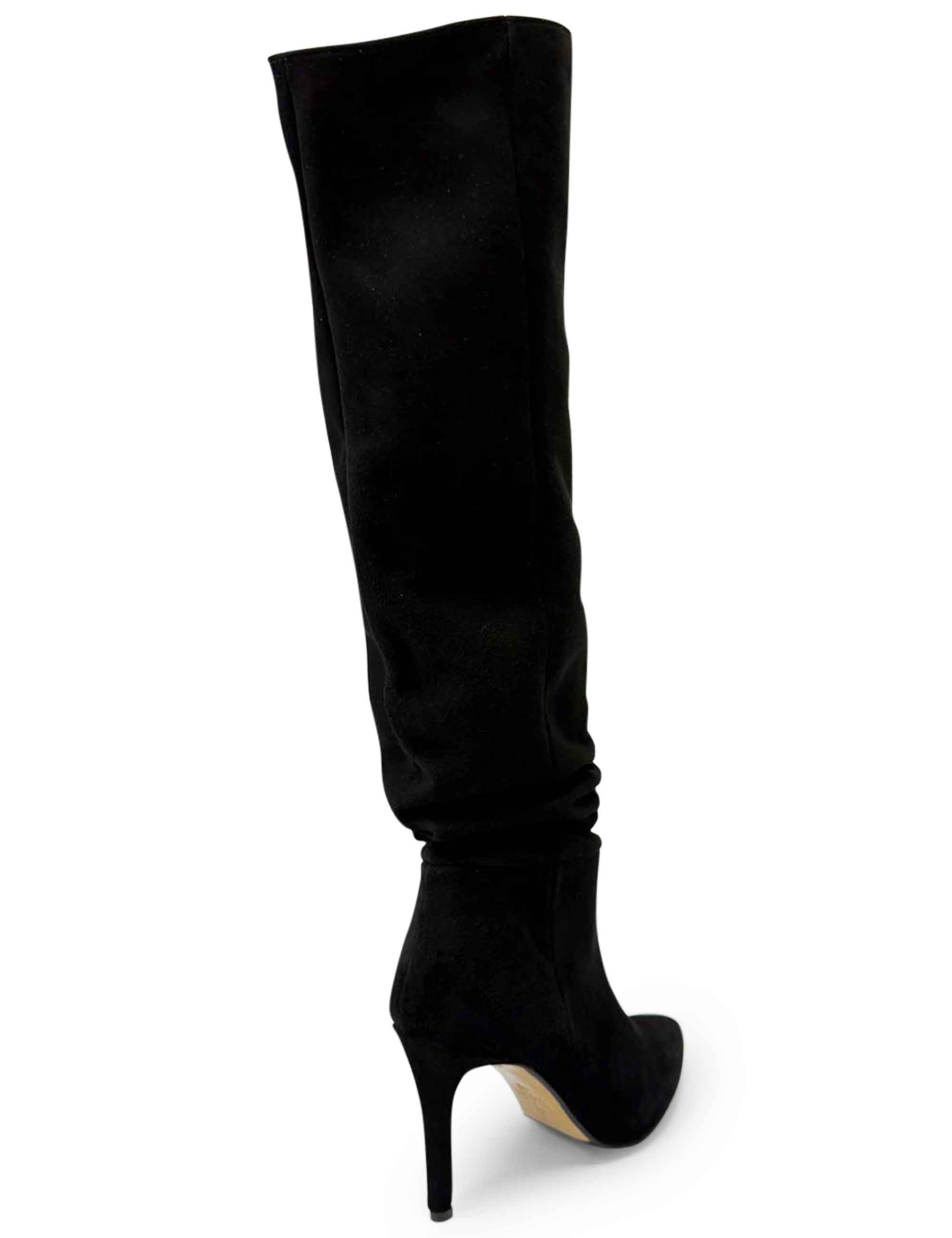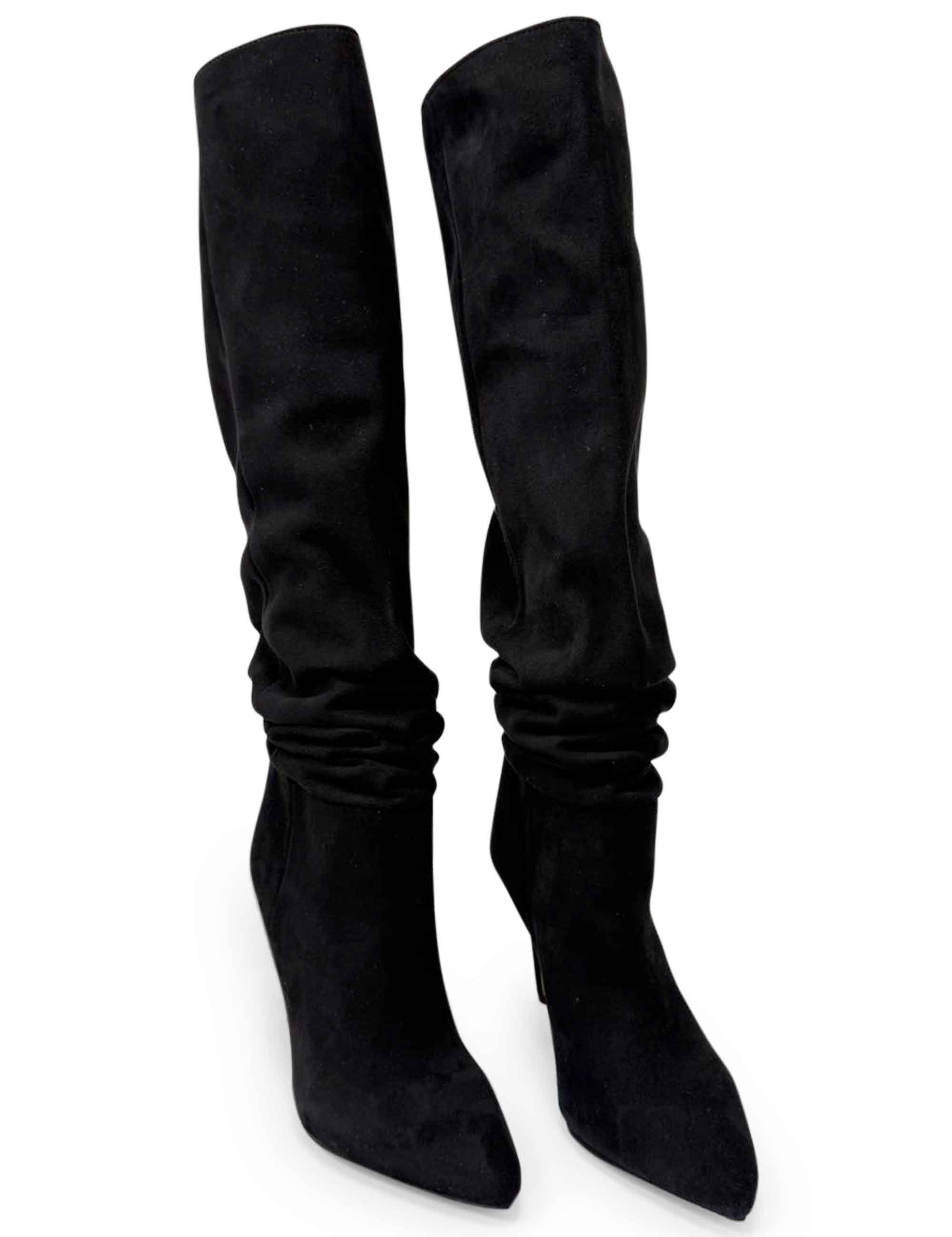 Stivale alto in camoscio nero, elegante e raffinato. Realizzato artigianalmente in Italia con lavorazione a Sacchetto per offrire comfort e flessibilità, valorizzando la silhouette.