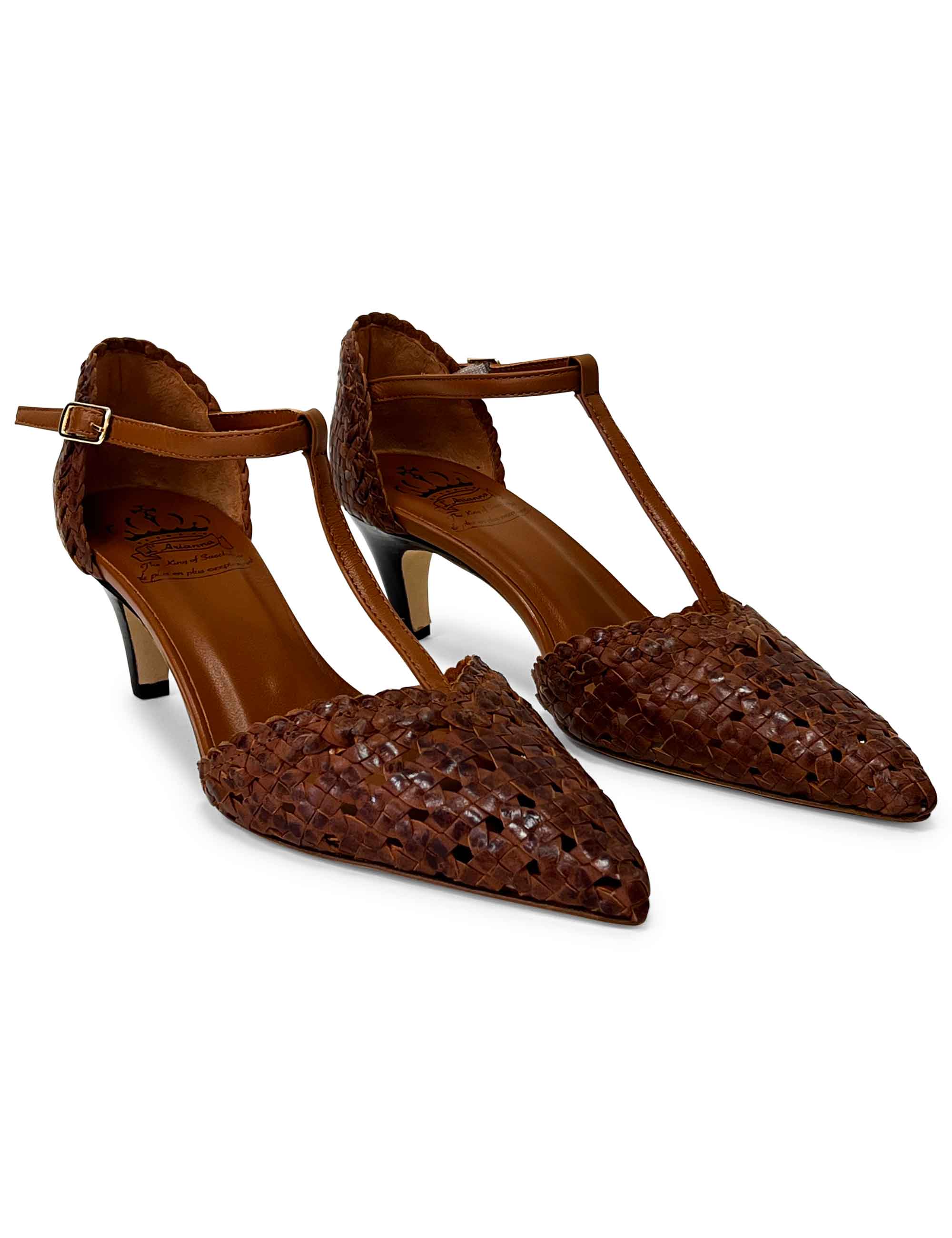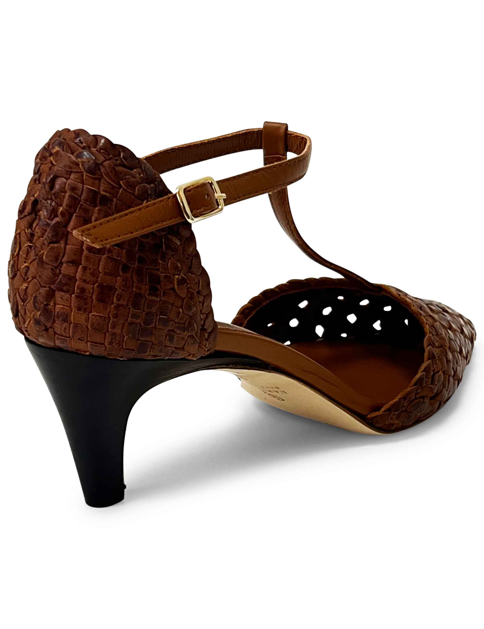 Tanguera da donna in pregiato intreccio di pelle color Toffee, elegante e versatile. Un modello femminile e confortevole, ideale per completare look da ballo o outfit più ricercati.