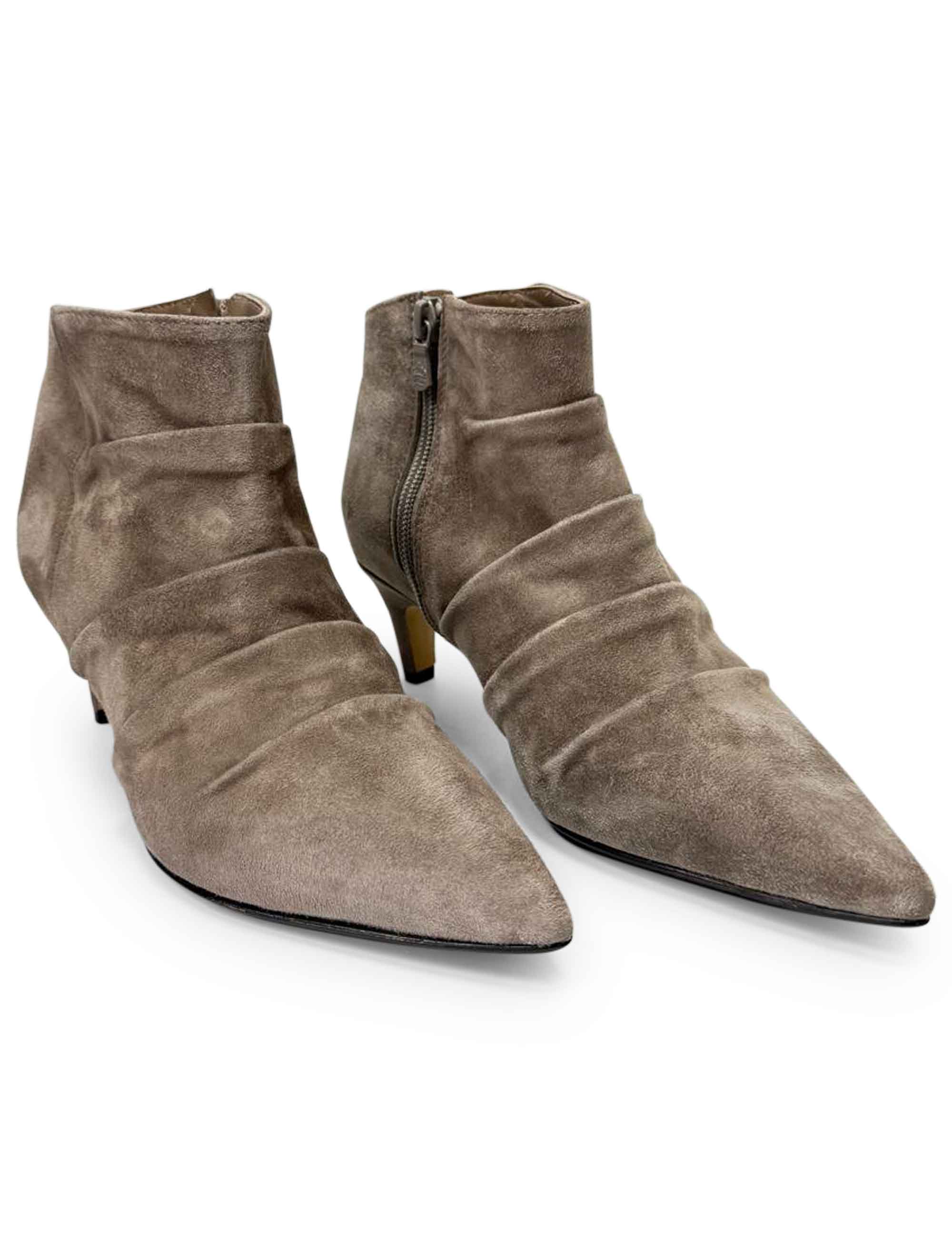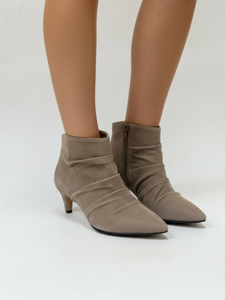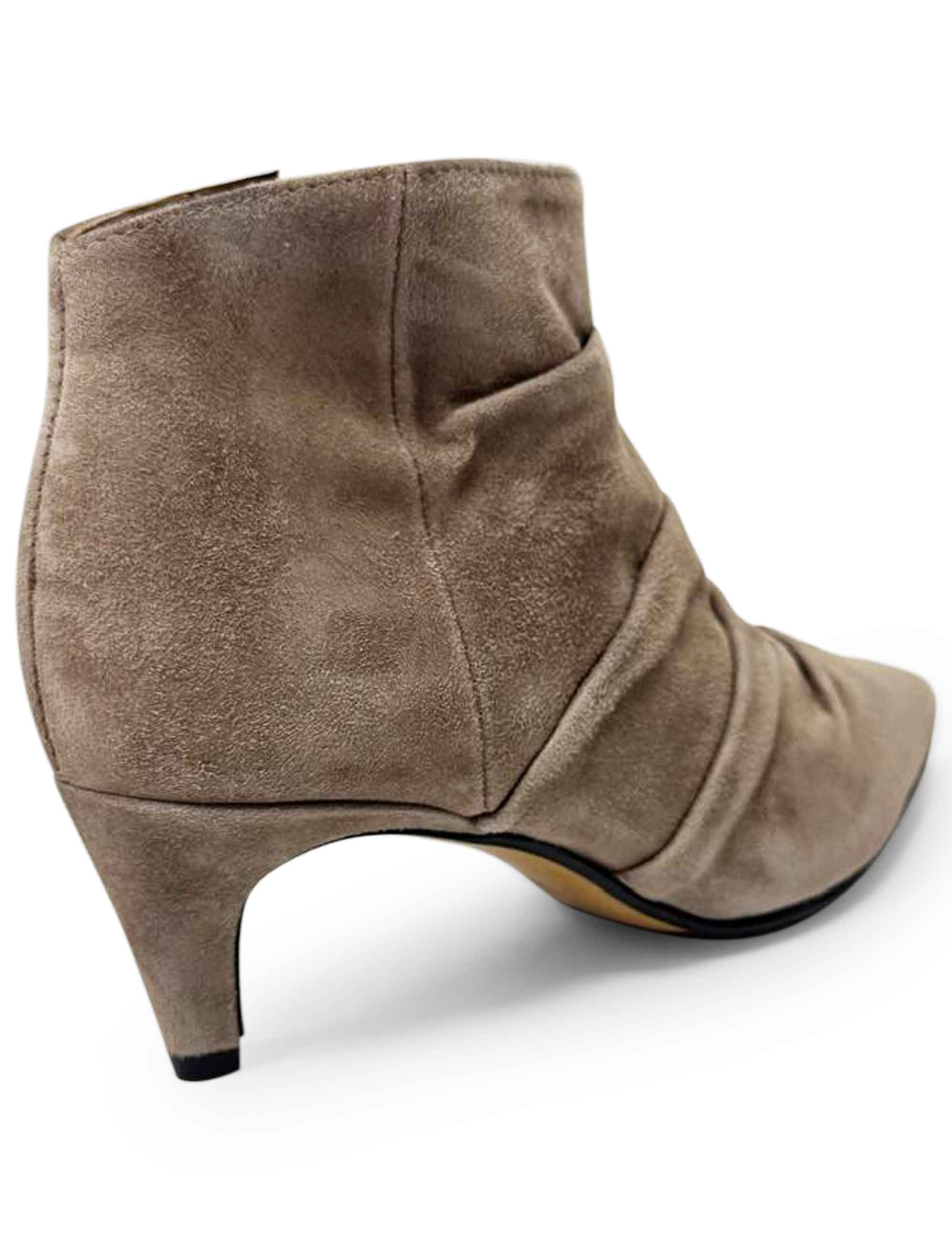 Tronchetto in camoscio grigio con effetto plissé, elegante e ricercato. Realizzato artigianalmente in Italia con lavorazione a Sacchetto per garantire comfort, flessibilità e una calzata perfetta.