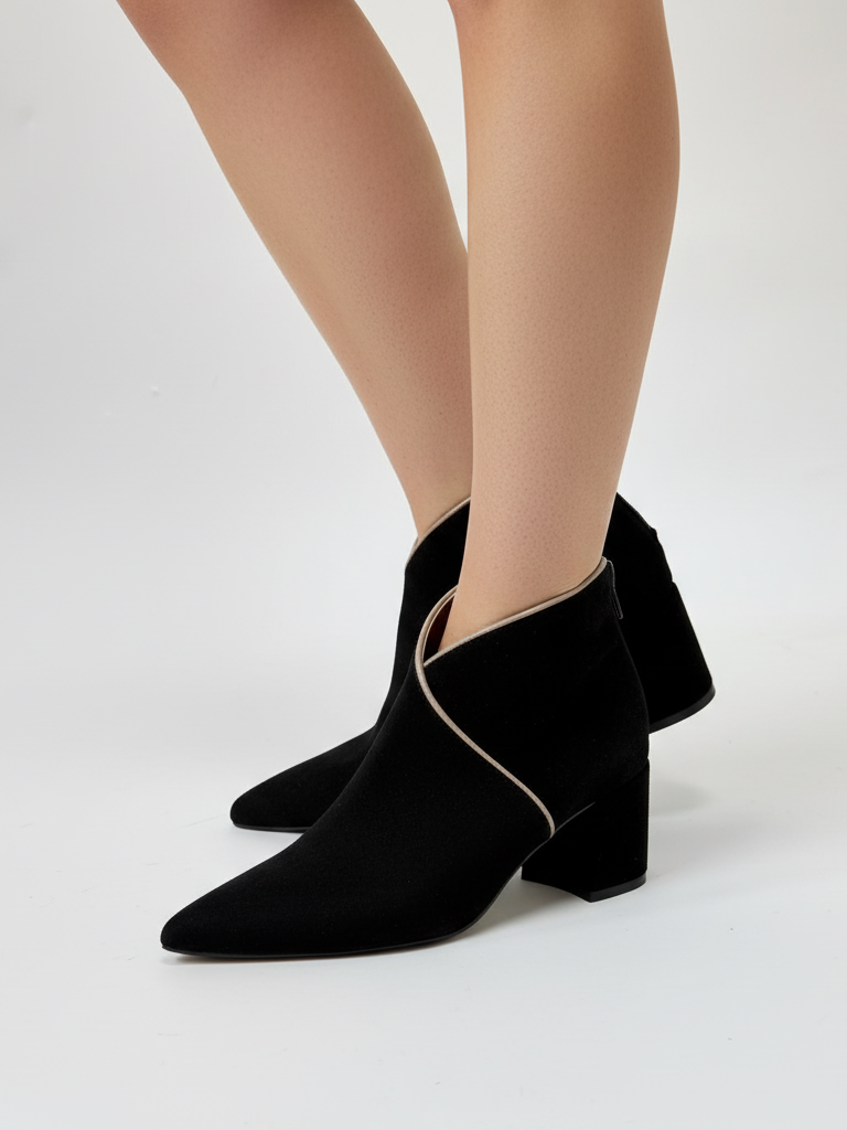Tronchetto in camoscio nero con tacco largo, elegante e confortevole. Realizzato artigianalmente in Italia con lavorazione a Sacchetto per garantire morbidezza, stabilità e una calzata perfetta.